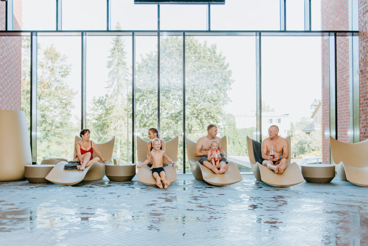 Lapsevanematele on lainelise seina ääres massaažikohad, kust saab mugavalt jälgida lapse turvalist suplemist.